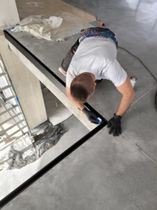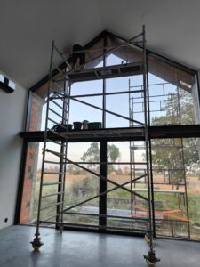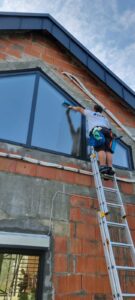 -Obustronne czyszczenie ponad 80 metrów kwadratowych przeszkleń- ze względu na zabrudzenie materiałami budowlanymi wybraliśmy metodę mycia ręcznego. Ze względu na ponad 7 metrową wysokość przeszkleń oraz wiele nieotwieralnych okien użyliśmy rusztowań oraz drabin .