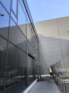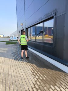 – Usuwanie zanieczyszczeń punktowych oraz ptasich odchodów z metalowej elewacji hali magazynowej