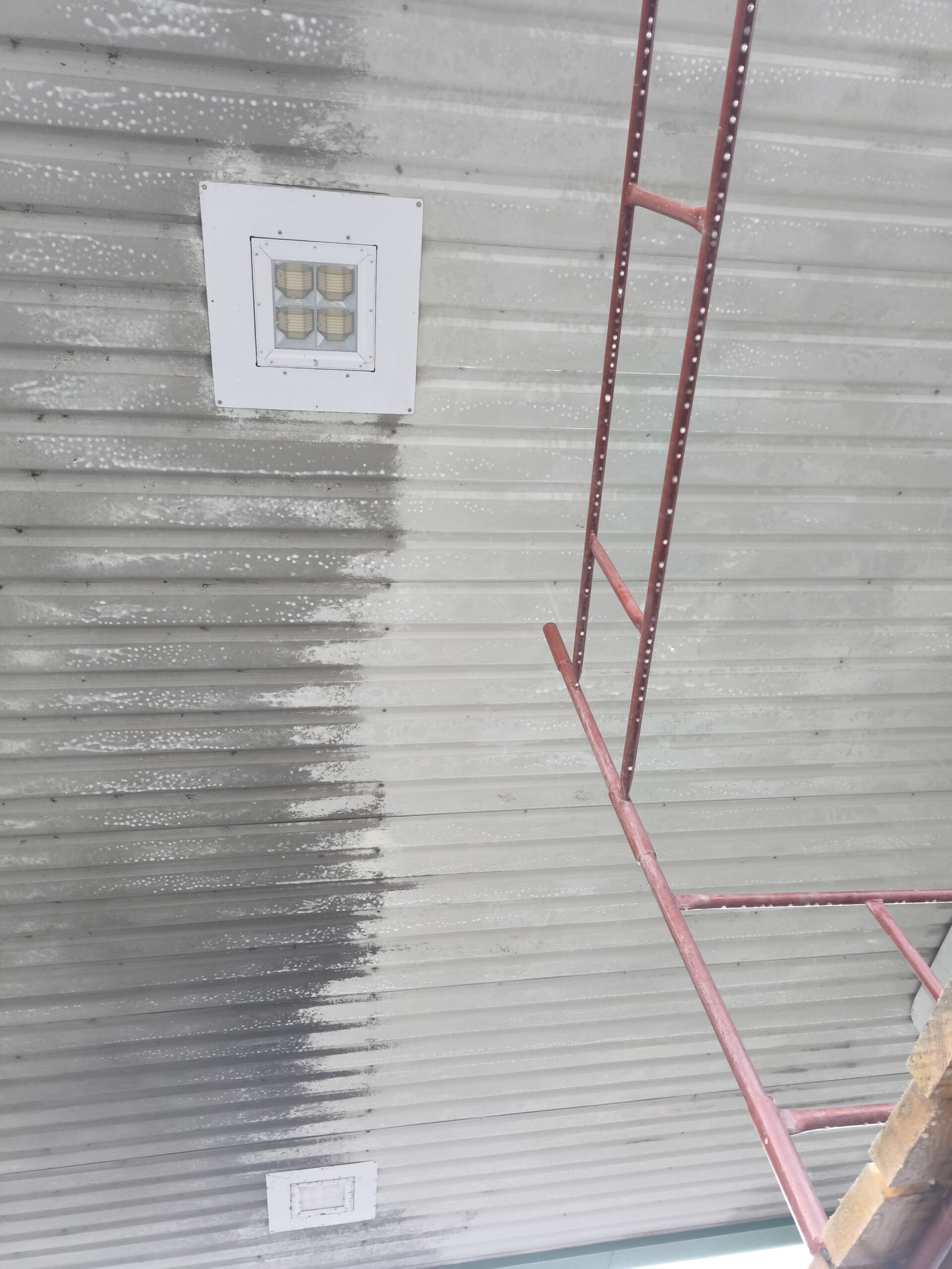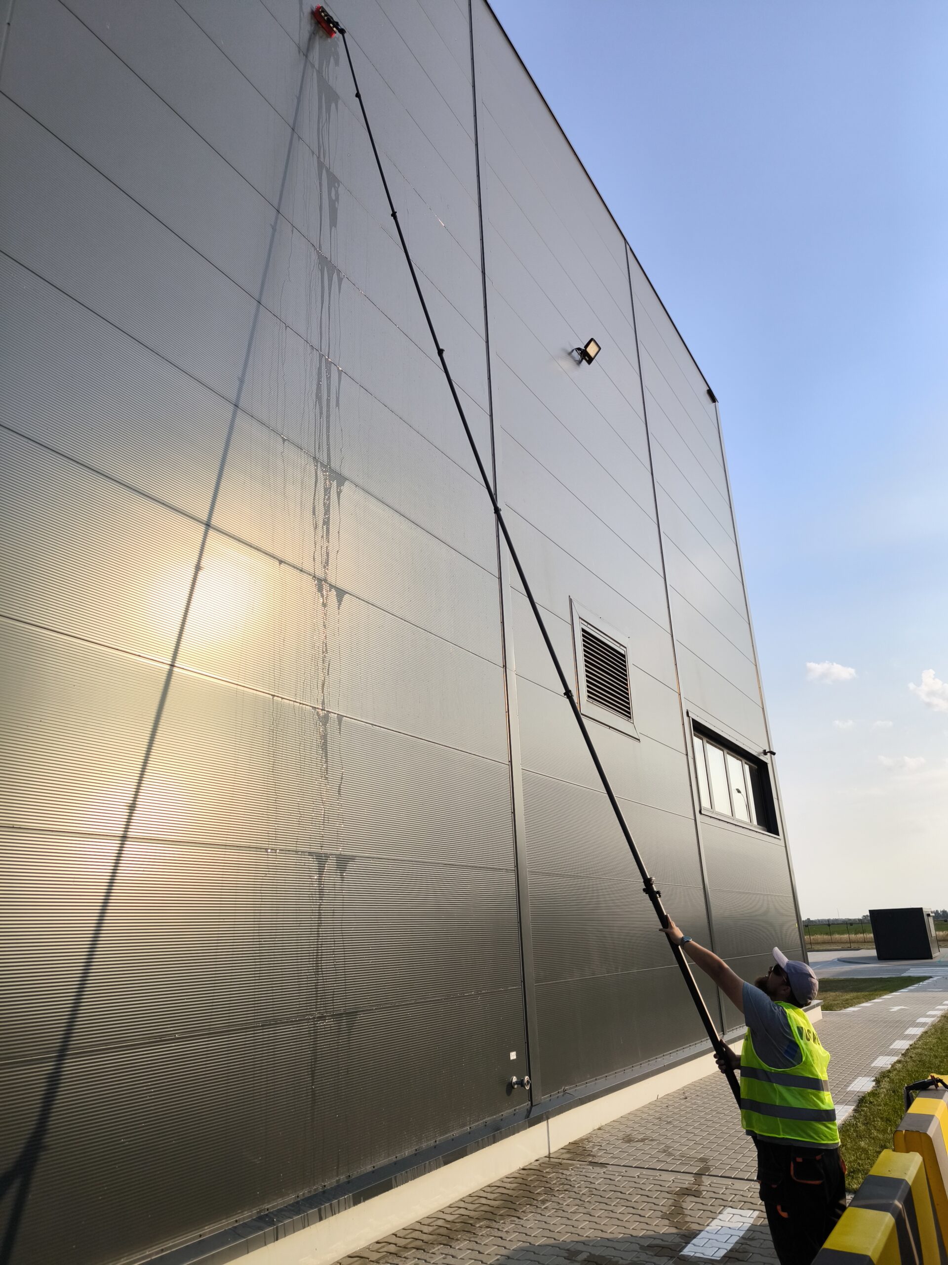 – Usuwanie zanieczyszczeń punktowych oraz ptasich odchodów z metalowej elewacji hali magazynowej