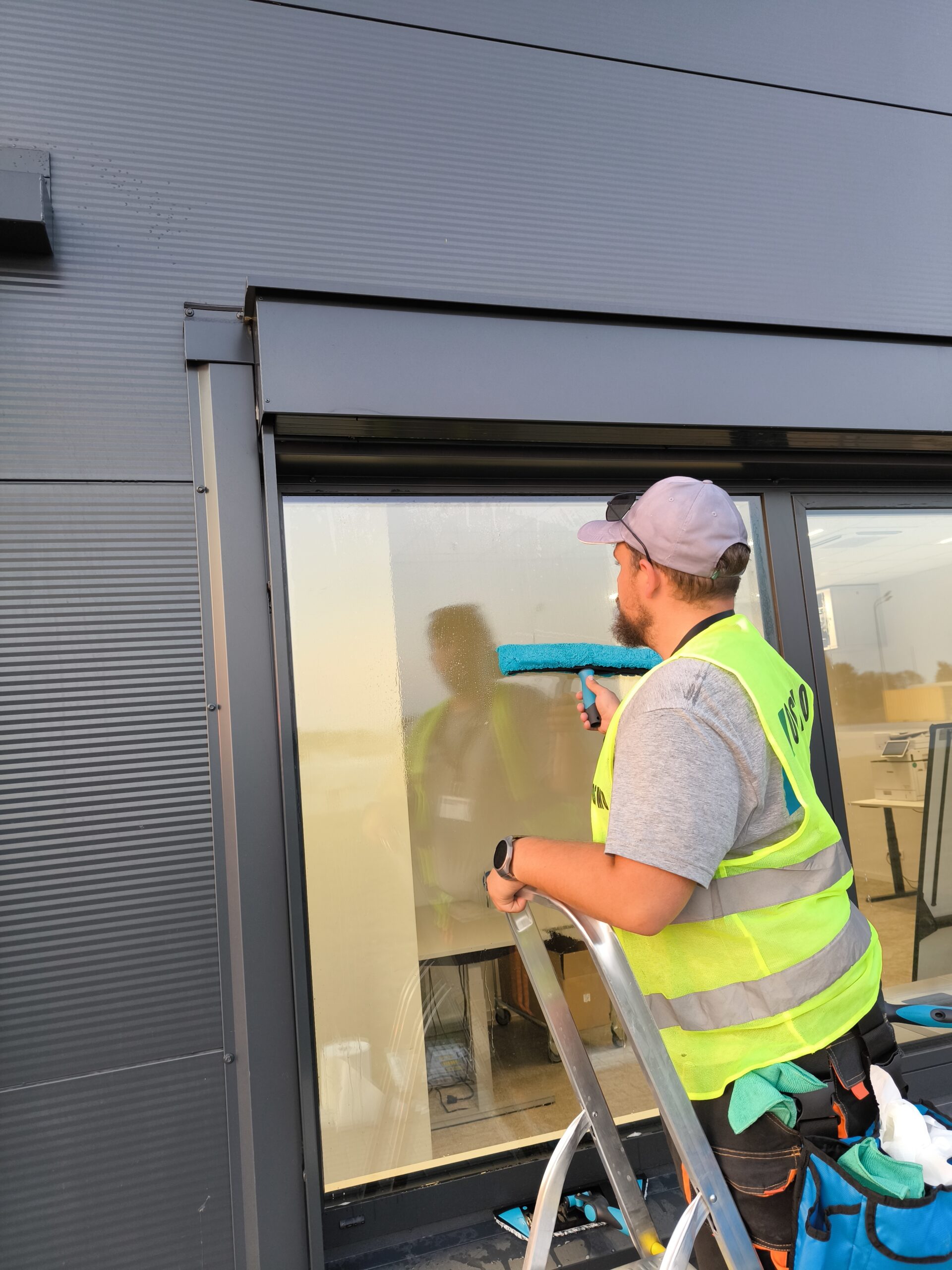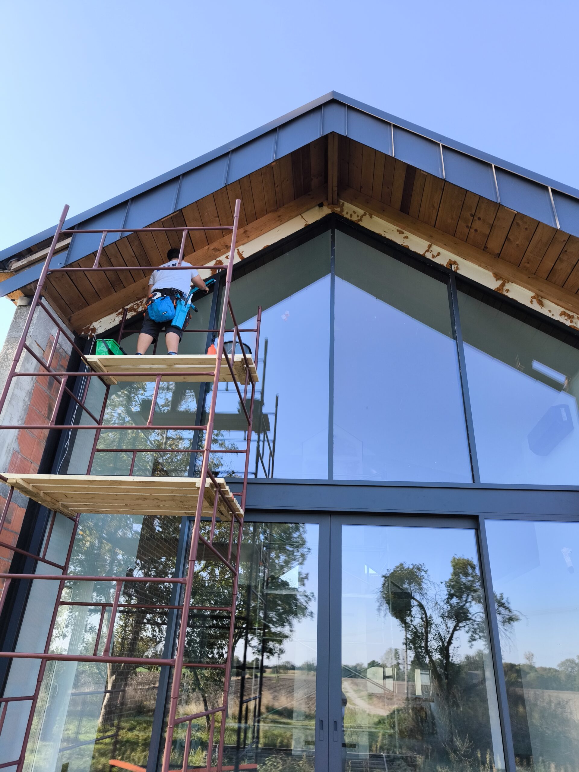 -Obustronne czyszczenie ponad 80 metrów kwadratowych przeszkleń- ze względu na zabrudzenie materiałami budowlanymi wybraliśmy metodę mycia ręcznego. Ze względu na ponad 7 metrową wysokość przeszkleń oraz wiele nieotwieralnych okien użyliśmy rusztowań oraz drabin .