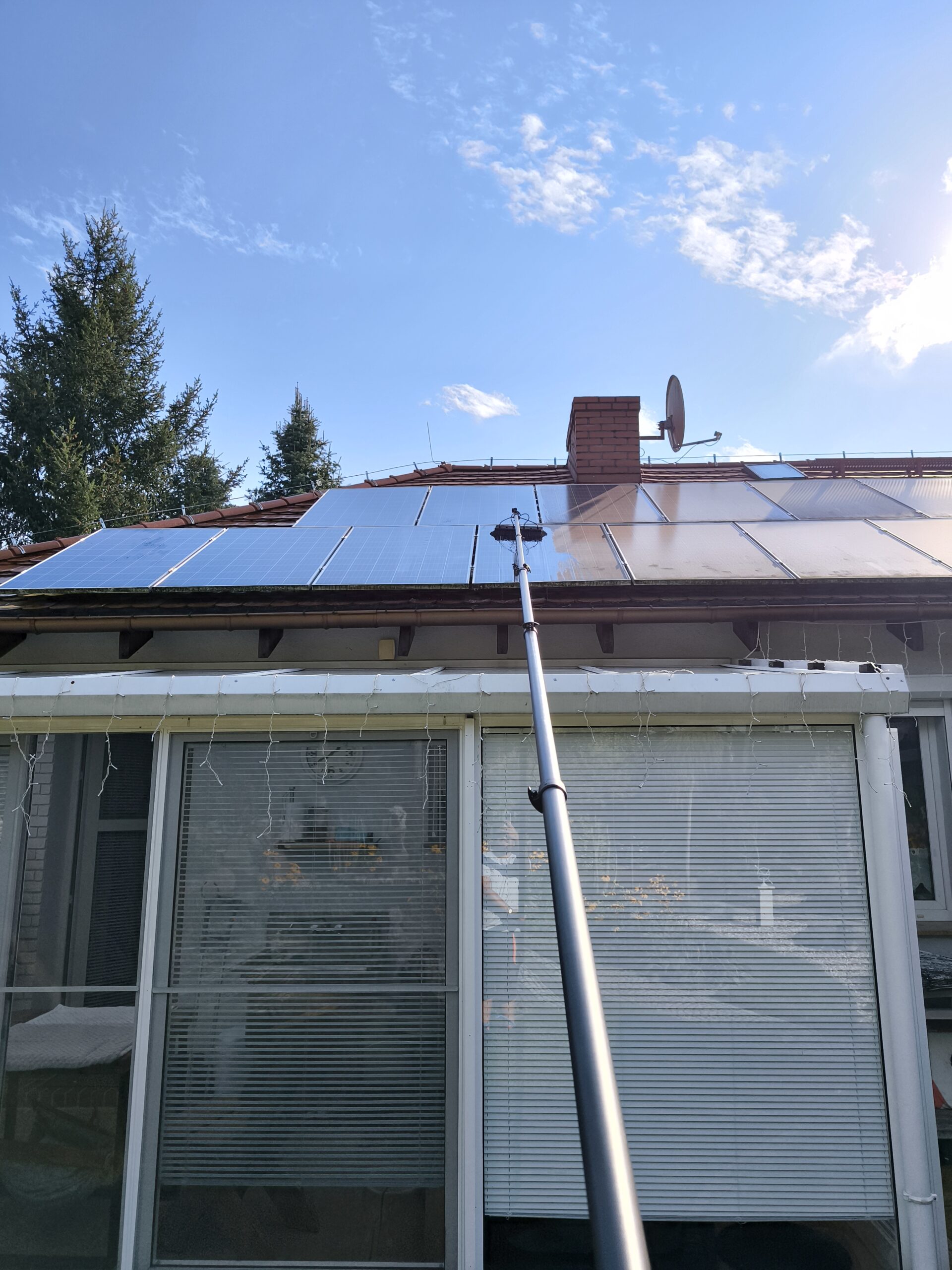 Zakres prac obejmował mycie paneli fotowoltaicznych oraz przeszkleń wraz z żaluzjami ogrodów zimowych w nowoczesnym pałacyku z ogromnym ogrodem. Panele nie były zlokalizowane idealnie na południe a obecność wielu drzew, krzewów spowodowała bardzo duże zanieczyszczenia na 8 letnich panelach. Niestety wzdłuż obramowań paneli można już zauważyć częściową degradację powierzchni spowodowaną przez zalegający mech. Przy instalacji w 2016 roku bardzo popularny był mit, że paneli fotowoltaicznych się nie myje przez co brud kumulował się latami. Domycie 50 sztuk paneli zajęło nam aż ponad 8 godzin.